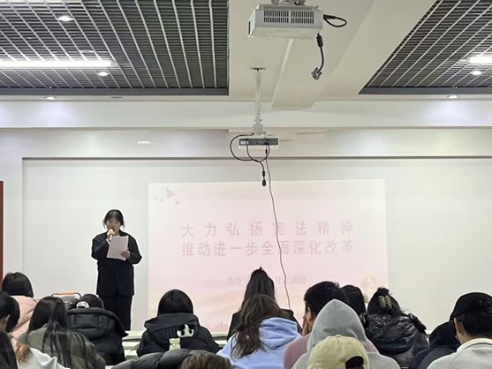 讲座过程中,法学社理论宣讲员围绕“宪法精神与全面深化改革”的主题,从宪法的历史、地位、作用以及全面深化改革与宪法的关系等方面进行了讲解。同时,还结合具体案例,生动诠释了宪法精神在现实生活中的应用,让同学们对宪法有了更加直观的认识。