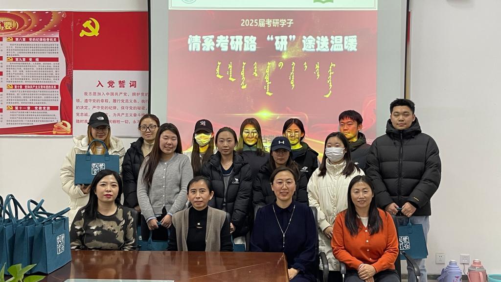 为帮助2025届考研学生缓解备考压力,激发备考热情,坚定考研信心,12月18日下午,蒙古学学院在崇文楼B221室开展“情系考研路‘研’途送温暖”考研慰问活动。学院党总支书记格根塔娜、副书记孔春艳,副院长小花以及考研学生参加。辅导员乌日汉主持活动。