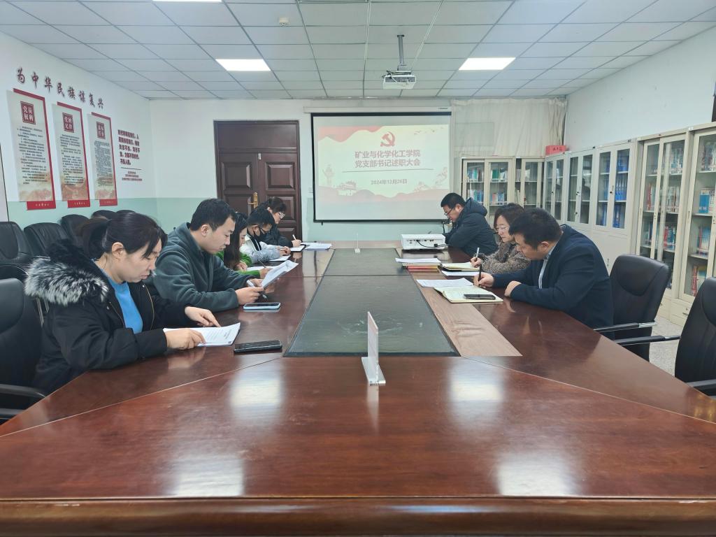 为进一步加强基层党组织建设,提升党建工作水平,充分发挥基层党支部的战斗堡垒作用,12月26日上午,矿业与化学化工学院党总支在会议室召开2024年度党支部书记述职评议会。会议由学院院长郭文彬主持,学院党总支书记张阳、副书记敖岩辉及所有党总支委员参加了会议。