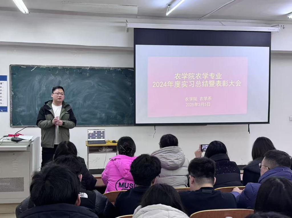 3月5日晚,农学院农学系在科技楼323教室召开2024年度实习总结暨表彰大会。本次会议采用线上线下相结合的方式,农学系全体教师、2022级农学班全体学生现场参会,2021级农学班学生以线上方式同步参与了此次大会。本次会议由2022级农学班学生王诗宇主持。