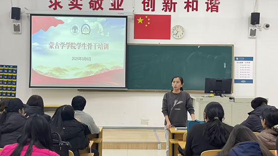为进一步提升学生干部的综合素质与组织管理能力,加强学生干部队伍建设,3月6日晚,蒙古学学院在崇文楼B209教室开展了学生骨干培训座谈会。学院党总支副书记孔春艳及学生会成员、青年志愿者协会、班级干部、团干部等80余名学生骨干参加,学院团学办主任额尔布乐图主持会议。