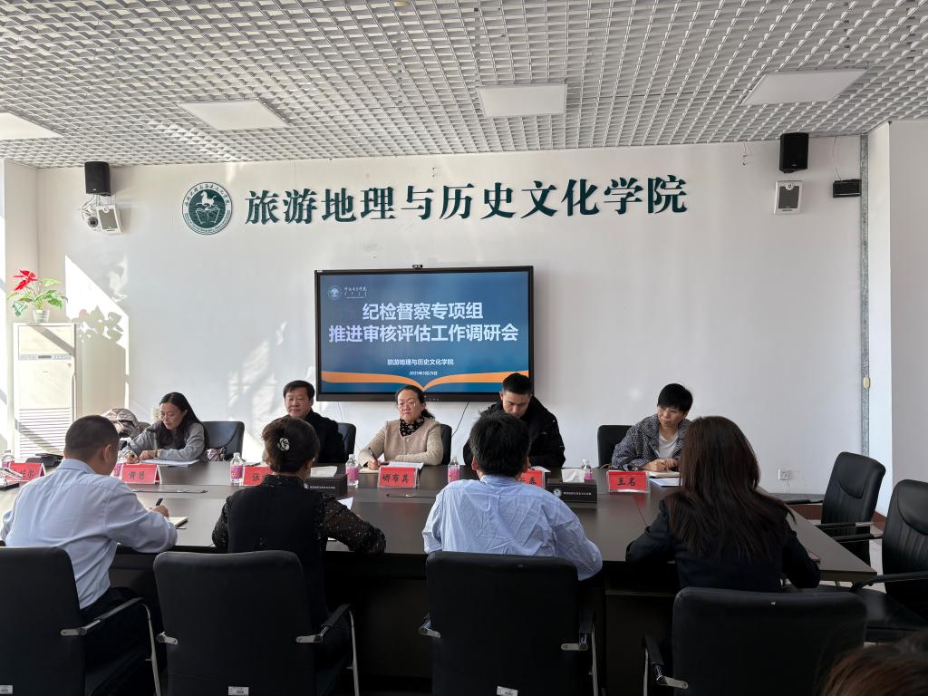 3月25日,学校本科教育教学审核评估专项组深入旅游地理与历史文化学院召开调研会。纪委监察专员办公室主任张斌、副主任王名,评建办副主任娜布其及相关人员,旅游地理与历史文化学院领导班子成员、综合办及系主任参加了调研会。
