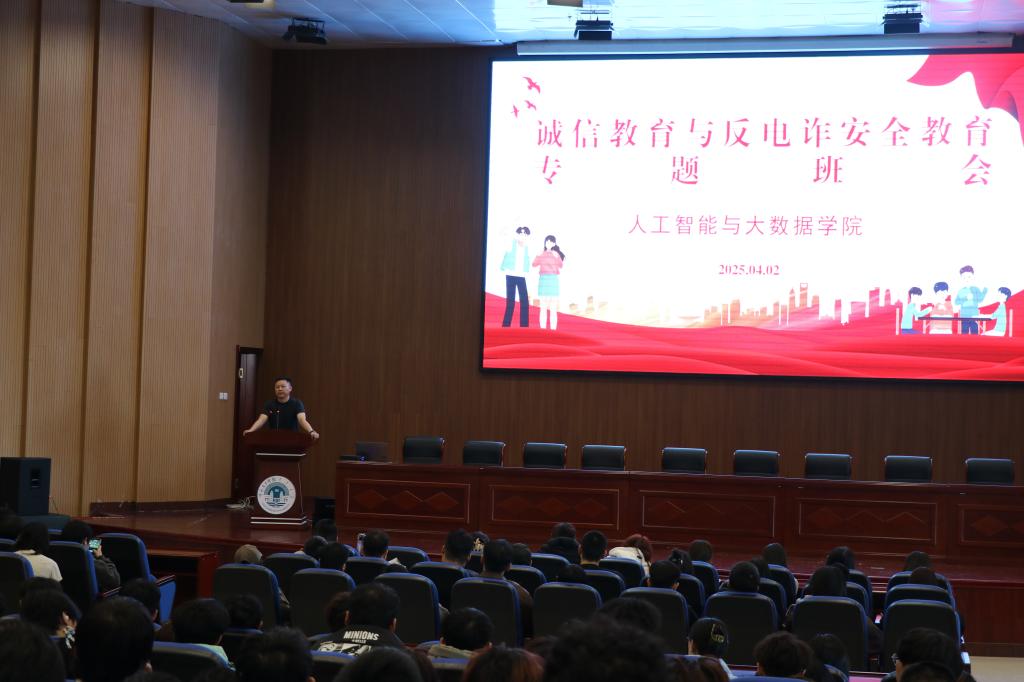 为深入落实校园安全教育要求,切实提高学生防范电信网络诈骗意识与能力,4月3日,人工智能与大数据学院召开以“诚信教育与反电诈安全教育”为主题的反诈专题班会。学院党总支书记朱福生、副书记赵君与团学办主任肖慧英深入各年段学生在三个会场主讲,实现全员覆盖。