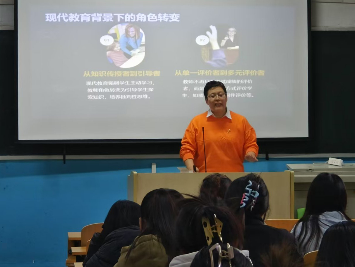 在讲座中,李晓光对教师在现代教育下的角色转变,包括从知识传授者到引导者,从单一评价者到多元评价者进行了深度讲解,从教育心理学视角、社会文化视角、技术整合视角等多维视角下进行角色解构,让学生们了解教师作为社会价值观和文化的传承者,不仅是知识的传递者,更是学生情感和心理发展的引导者。