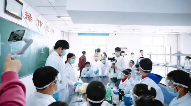 活动过程中,化海实践宣讲团成员张丽颖、蒋文达围绕实验室安全规范进行详细讲解,通过现场演示指导小学生正确穿戴实验服、护目镜,并强调药品使用注意事项。孩子们认真聆听、积极互动,以规范的操作完成防护装备穿戴,展现出对科学实验的严谨态度。
