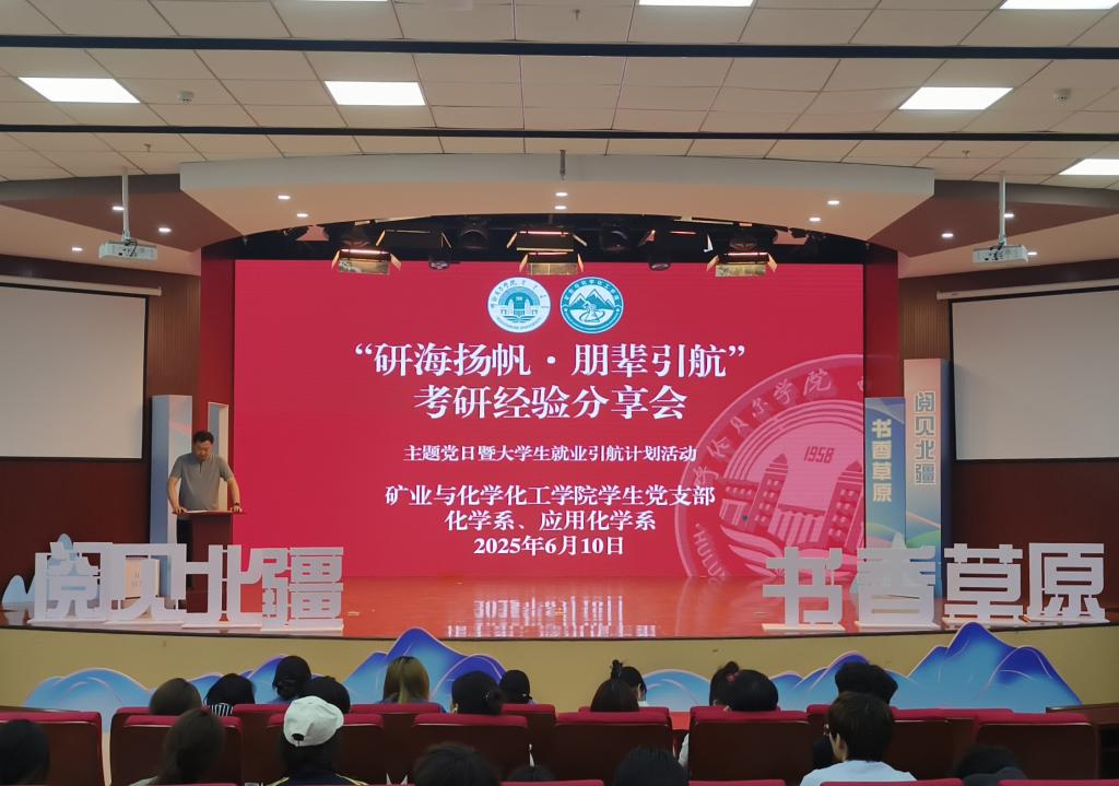 为进一步强化学生学业职业规划意识,进一步发挥榜样的示范引领作用,帮助学生及时做好考研规划,助力良好学风氛围的形成,6月10日下午,矿业与化学化工学院学生党支部联合化学系、应用化学系举办“研海扬帆·朋辈引航”考研经验分享主题党日暨“大学生就业引航计划”活动。5名已成功考取研究生的2025届优秀毕业生化身“备考导师”进行了现场交流分享。学生党支部书记孟庆永、化学系主任齐霞、应用化学系主任李静、专业课教师黄媛及学生党支部党员、发展对象、入党积极分子及相关专业学生共计80余人参加了活动。活动由孟庆永主持。