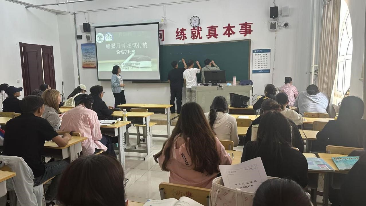 2024级二班则举办了“翰墨丹青,粉笔传韵”粉笔字比赛。活动注重实践性与专业性相结合,参赛同学在黑板上挥洒笔墨,展现不同风格的书法作品。学业导师银花从笔画结构、书写规范等维度进行专业评审,并通过优秀作品展示促进交流互鉴,为学生未来从事教育教学工作夯实基础。