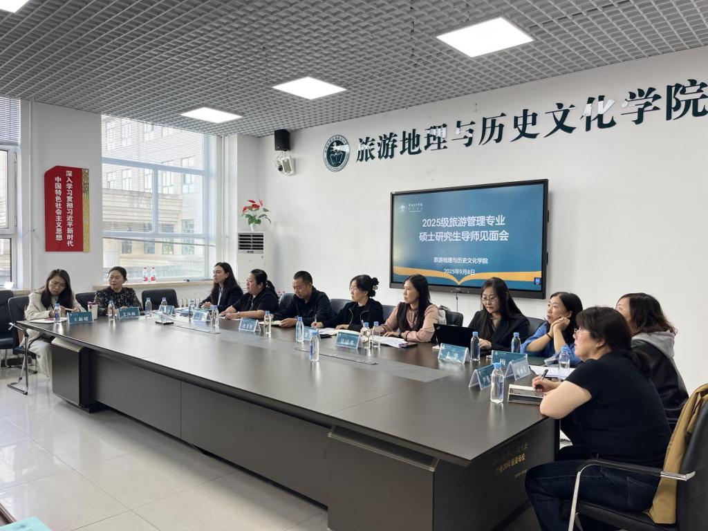 为使2025级旅游管理专业硕士研究生更好地融入学院氛围、深入了解校内导师的学术背景与研究方向,推动师生双向选择工作顺利开展,9月8日下午,旅游地理与历史文化学院旅游管理专业硕士研究生导师见面会在崇文楼B321会议室召开。会议由学院院长白絮飞主持。学院领导班子成员、乡村振兴研究中心副主任吴清秀等10名导师参加了见面会,学院研究生办公室全体教师、2025级研究生新生参加会议。