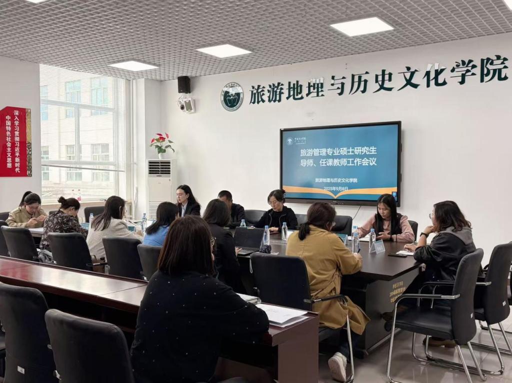 为进一步加强旅游管理专业硕士学位点建设,提升研究生培养质量,9月8日下午,旅游地理与历史文化学院在崇文楼B321会议室召开旅游管理专业硕士研究生导师、任课教师工作会议。学院党总支书记赵金辉、院长白絮飞、副院长徐舒静,旅游管理专业硕士研究生导师、任课教师和研究生办公室全体教师参会,会议由白絮飞主持。