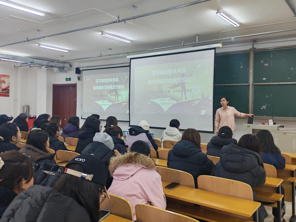 孔春艳作了题为“在不确定的未来里,如何做自己的确定性锚点”的讲座。她从四个维度展开讲解,一是全面分析不确定性现状,阐述经济形势波动、行业发展变化、技术革新冲击等因素对就业市场和个人职业发展的影响;二是探讨在不确定未来中确定性对个人职业发展的重要意义,强调其能提供心理支撑、明确发展方向,帮助毕业生从容应对复杂环境;三是给出构建自身确定性锚点的策略,从提升综合素质、明确职业目标、建立良好人际关系等方面提供建议,并通过分享成功毕业生案例,增强建议的说服力与可操作性;四是预测未来就业市场趋势,鼓励毕业生以积极心态迎接挑战、把握机遇。