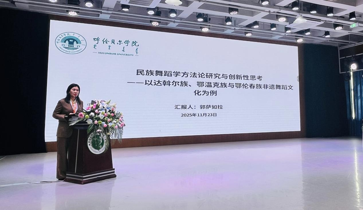 23日上午,郭萨如拉以《民族舞蹈学方法论研究与创新性思考——以达斡尔族、鄂温克族与鄂伦春族非遗舞蹈文化为例》为题作专题汇报。她的汇报聚焦北疆地区独具特色的达斡尔族、鄂温克族与鄂伦春族非物质文化遗产舞蹈,从方法论层面深入探讨民族舞蹈学研究的新路径,并提出富有建设性的创新思考。