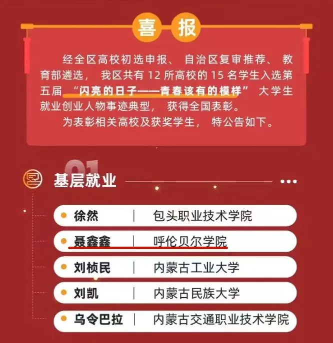 此次毕业生就业创业先进典型选拔,经全区高校初选申报、自治区复审推荐、教育部遴选多个环节审核筛选,全区共有12所高校的15名学生入选。