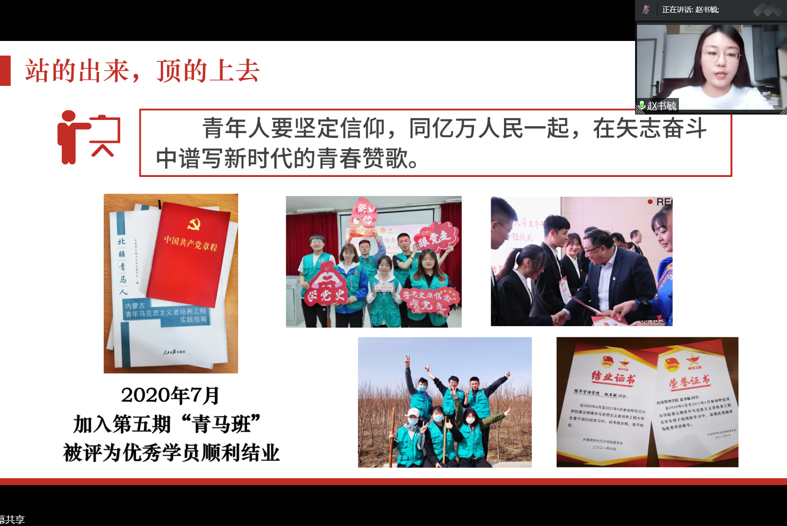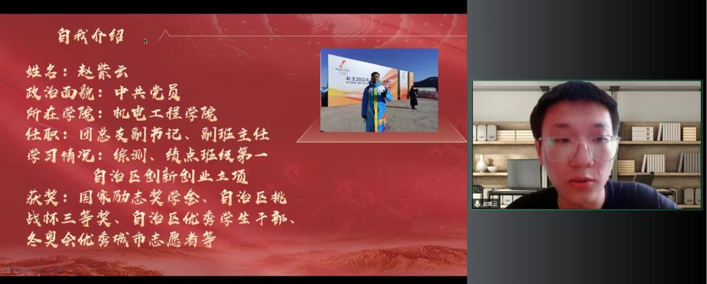 分享会上,马克思主义学院王佳同学以“自强不息,追求卓越”为主题,结合自身的实际经历,围绕怎样更好地在学术比赛中提升自我,在担任学生干部的过程中如何更好地服务同学等内容进行了分享。经济管理学院赵书毓同学以“循梦而行,向阳而生”为主题进行了分享。她从自己学习情况讲起,谈了担任经济管理学院团总支副书记、参加各类志愿服务活动、比赛的心得体会。机电工程学院赵紫云同学以“青春奋斗,爱在志愿”为主题分享了自己的志愿服务经历,他从担任北京冬奥会志愿者、疫情防控志愿者等经历谈起,结合图片和视频回忆了志愿服务过程中的感动和坚守。