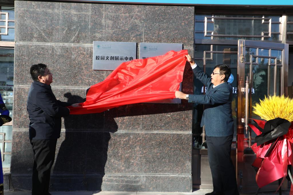 揭牌仪式上,王广利书记和李文阁校长共同为“Beat365唯一官方网站校园文创展示中心”揭牌。
