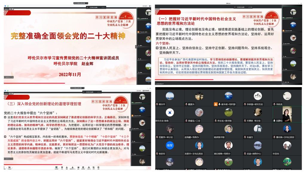 为深入学习贯彻党的二十大精神,切实把党员干部的思想和行动统一到会议精神上来,12月9日上午,机关党委邀请呼伦贝尔市学习宣传贯彻党的二十大精神宣讲团成员、历史文化学院副院长赵金辉副教授,在线上为全体党员开展题为《完整准确全面领会党的二十大精神》的宣讲会。机关党委书记、组织部部长吴静怡主持会议。