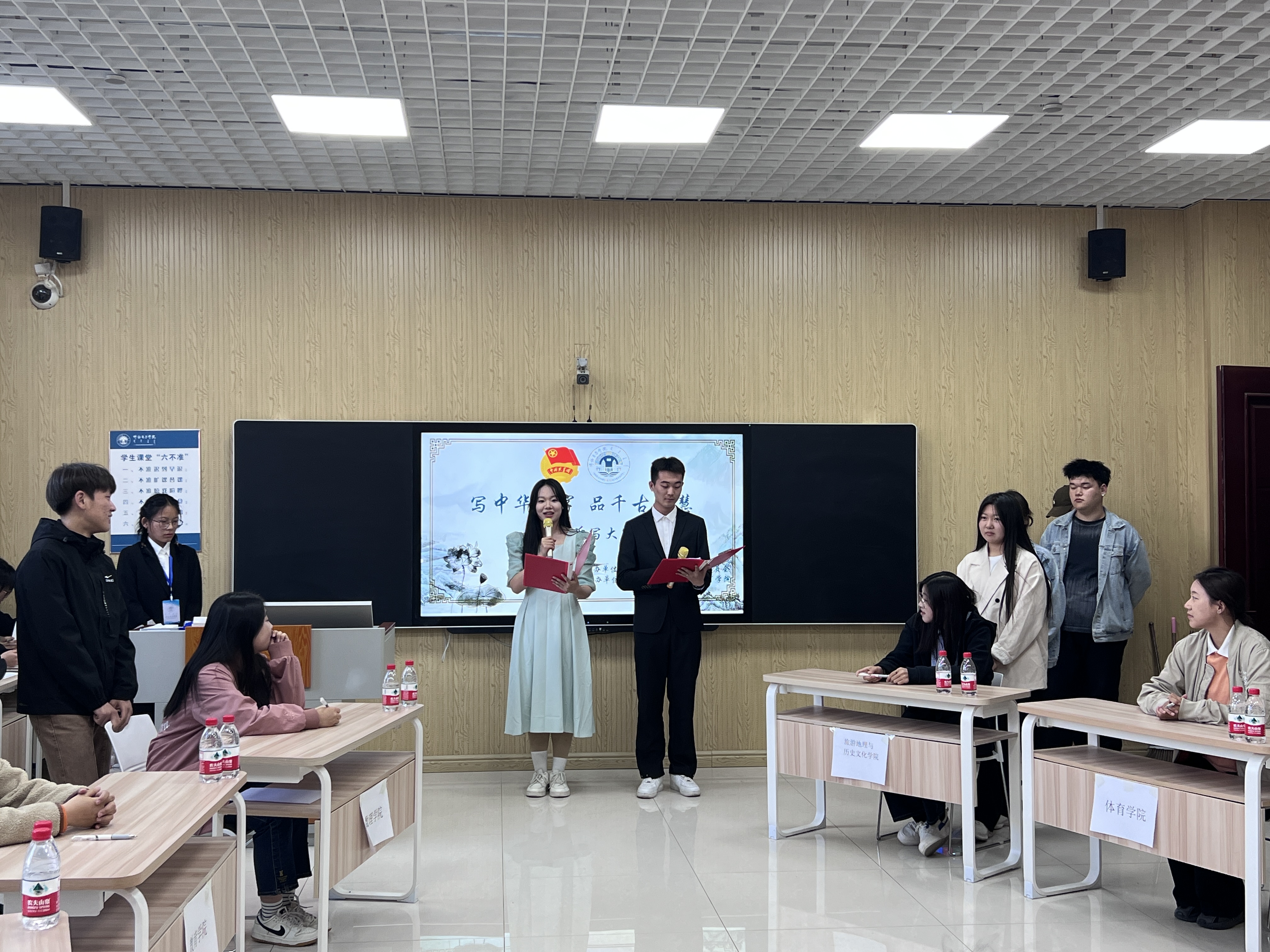 为提高学生使用国家通用语言文字的水平,5月20日,由校团委主办,体育学院与马克思主义学院联合承办的“写中华汉字品千古智慧”汉字听写大赛在崇文楼B125室召开。本次比赛的评委老师由校团委社团管理部部长盛超、体育学院团学办副主任卜祥云、马克思主义学院团学办副主任杜海钰担任,共有各学院组成的7支队伍参赛。