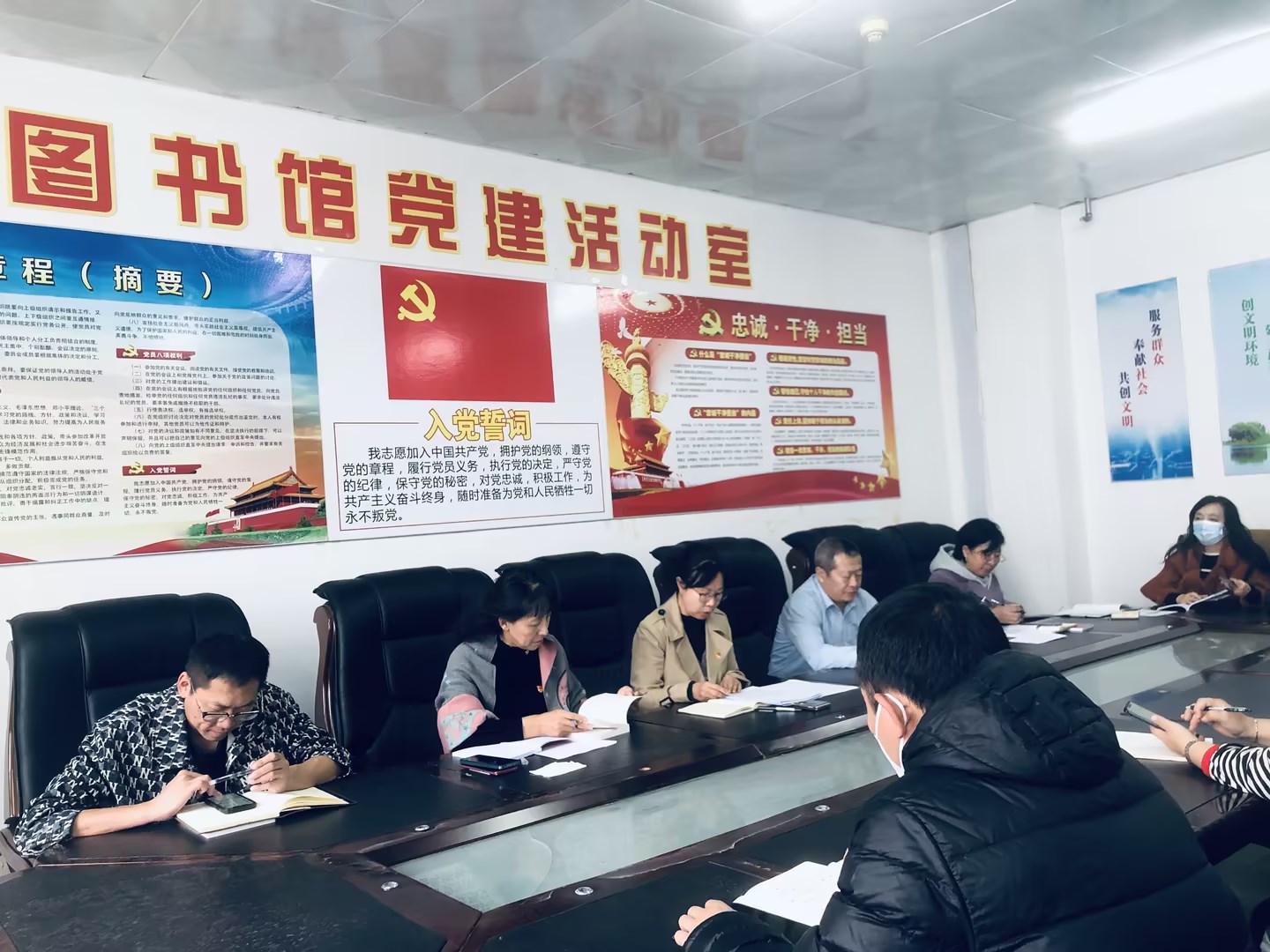 10月18日,在图书馆党建活动室,图书馆第一党支部和第二党支部联合开展主题教育党日活动,全体党员参加此次党日活动。