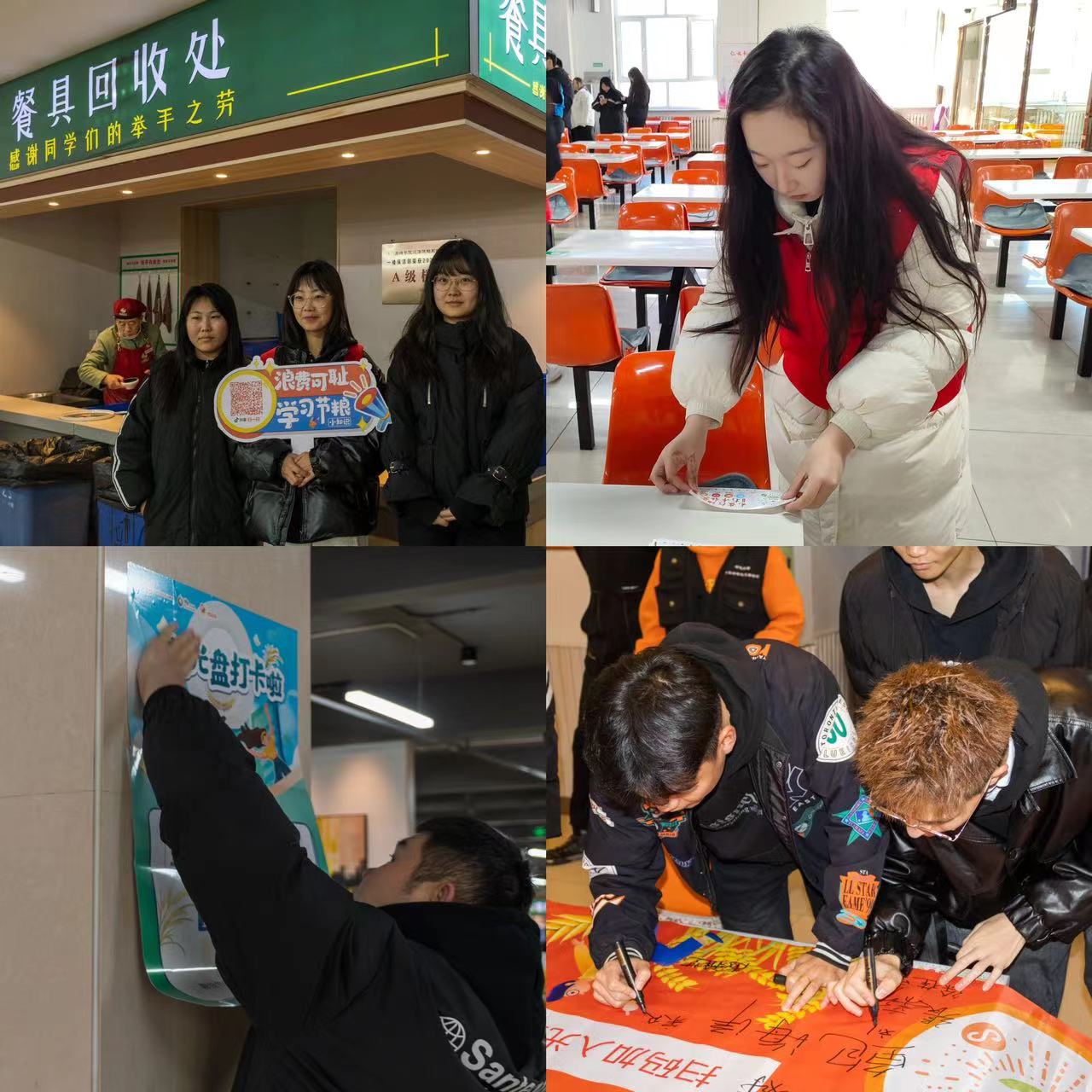 本次活动得到了后勤管理处的支持。青年志愿者协会、绿色环保志愿服务队、蒲公英公益社团等志愿公益类社团的学生们组成校内爱粮节粮志愿服务队,通过在学校餐饮中心、麦谷食堂张贴宣传海报、张贴“光盘行动打卡”桌贴、进行“光盘行动”条幅签名、“我与光盘打卡手举牌”合影等活动形式,积极引导就餐学生爱惜粮食,杜绝浪费。活动现场,志愿者们还依托光盘打卡小程序,组织学生们参与“光盘打卡”战队,开展21天线上打卡,养成光盘好习惯。
