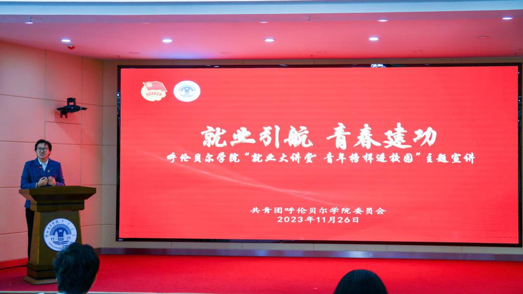 活动邀请到了3位在科技创新、乡村振兴、绿色发展、社会服务、卫国戍边等领域努力奋斗的优秀青年代表,走进学校、面向青年讲述个人就业选择和奋斗故事,引导广大青年学生积极在强国建设、民族复兴伟业中挺膺担当。呼伦贝尔市海拉尔区伊敏小学副校长张海霞结合个人成长经历和奋斗故事进行了宣讲,勉励在校生做好人生规划,脚踏实地走好每一步。天津市消防救援总队信息化办公室工程师、三级指挥长解传鑫将自身专业发展与目前消防工作岗位相结合进行了宣讲,鼓励在校生无畏困难、永不言弃,不断学习,勇于追梦。呼伦贝尔环保志愿者协会会长代守扬作为第十一届母亲河奖“绿色项目奖”获奖人,结合自身在绿色发展和志愿服务领域的个人就业选择和奋斗故事展开宣讲,鼓励在校生积极投身志愿服务,共同建设美丽中国。