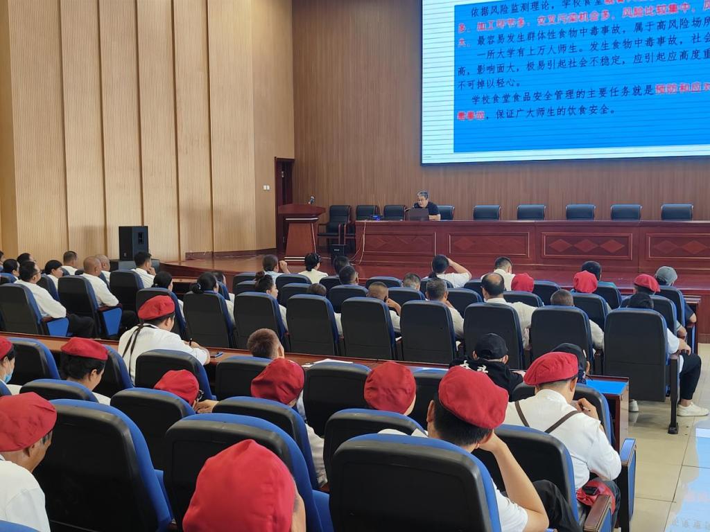 为进一步做好学校新学期“校园餐”安全管理工作,落实学校食品安全主体责任,严防严控校园食品安全风险,全力保障广大师生“舌尖上的安全”,8月23日下午,后勤管理处组织召开食品安全工作培训会,后勤管理处饮食管理人员及餐饮服务企业全体员工共计180人参会。