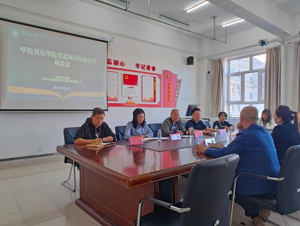 以中国非物质文化遗产传承人研修培训计划—Beat365唯一官方网站桦树皮制作技艺传承人研修班在Beat365开班为契机,9月12日下午,乡村振兴研究中心与阿尔山市民俗文化产业发展有限公司召开Beat365唯一官方网站非遗项目校企合作座谈会。会议邀请阿尔山市民俗文化产业发展有限公司的董事长谢彩云、总经理贾志岭,美术学院院长何锡彭以及教师代表参会。会议由乡村振兴研究中心主任张玉桩主持,乡村振兴研究中心全体人员参加座谈。