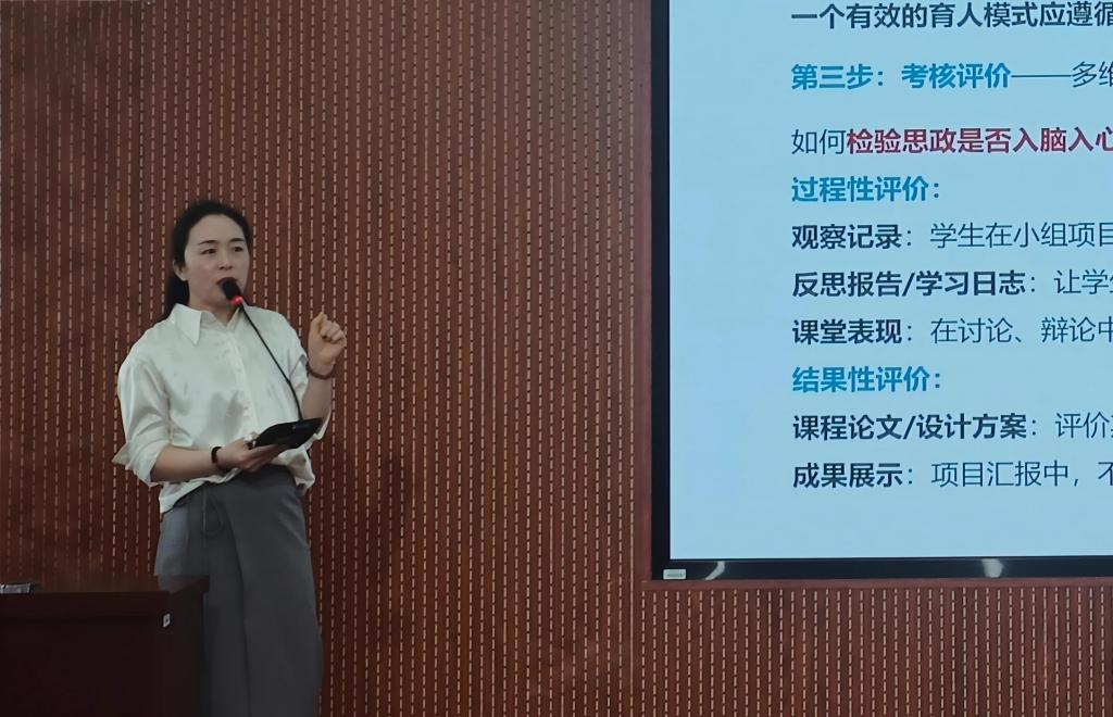 培训中,韩丽伟以“全员、全程、全方位”的课程思政建设理念为核心,结合教育部《高等学校课程思政建设指导纲要》要求,从政策解读、评审指标剖析、教学设计案例三个维度展开指导。她强调,课程思政的核心在于“如盐在水”的自然融合,需紧扣立德树人根本任务,将价值塑造与知识传授、能力培养有机统一。随后,她通过具体案例,详细阐述了如何挖掘专业课程中的思政元素,设计科学的教学主线,并构建可量化、可测评的育人成效评价体系。