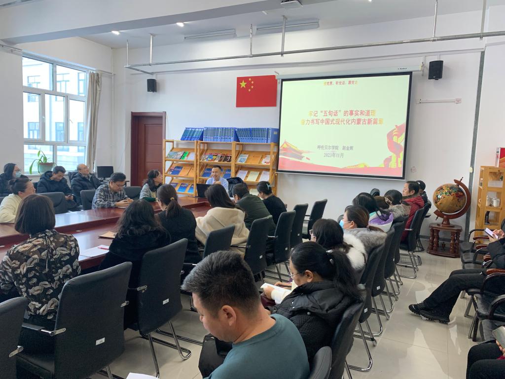 为持续深入学习贯彻习近平总书记对内蒙古的重要指示精神,12月13日下午,法学与经济管理学院特邀请旅游地理与历史文化学院党总支书记赵金辉来学院作主题宣讲,全体教职工参加学习。赵金辉以“感党恩、听党话、跟党走,奋力书写中国式现代化内蒙古新篇章”为题,围绕“五句话”的事实和道理,从内蒙古儿女始终与党中央保持的血肉联系出发,紧扣《国务院关于推动内蒙古高质量发展奋力书写中国式现代化新篇章的意见》(以下简称《...