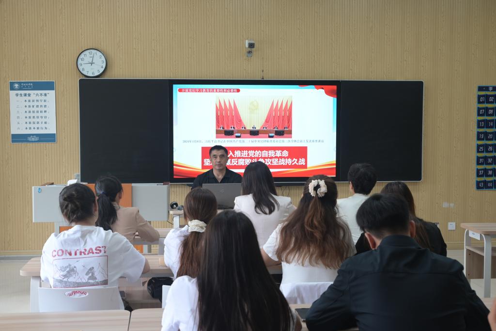 为推进党纪学习教育走深走实,6月22日下午,校党委副书记张宏天在艺术楼503教室讲授纪律党课,教育学院、工学院部分师生党员参加学习。本次党课以《学条例、守党纪,以严明的纪律推进党的自我革命》为主题,从开展党纪学习教育的重要性和必要性,《中国共产党纪律处分条例》(以下简称《条例》)修订的重要意义、主要亮点解读和在《条例》的贯彻执行中强化四种意识等四个方面进行详细讲解。张宏天系统梳理了“党的自我革命”战...