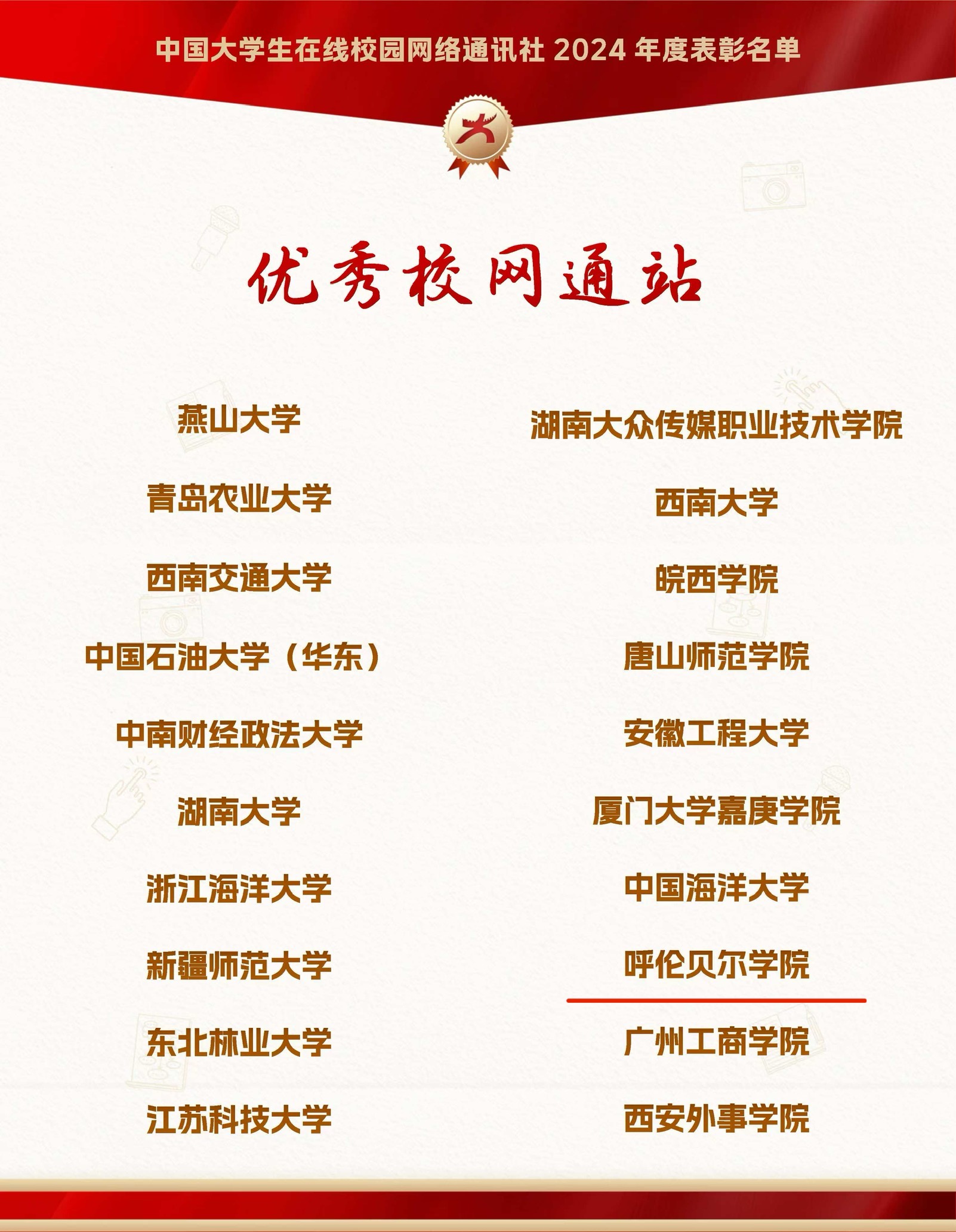 近日,教育部中国大学生在线公布了“中国大学生在线校园网络通讯社及校园行活动2024年度表彰名单”及第七届全国大学生网络文化节中国大学生在线校网通站高校入选名单,Beat365斩获7项荣誉。学校获评2024年度教育部中国大学生在线“优秀校网通站”,学校党委宣传部获评“校园行活动优秀组织单位”,白玫获评“校网通优秀指导教师”,崔壮获评“校园行新星指导老师”,作品《强国有我,青春有为——Beat365唯一官方网站》获评“年度优秀内容...