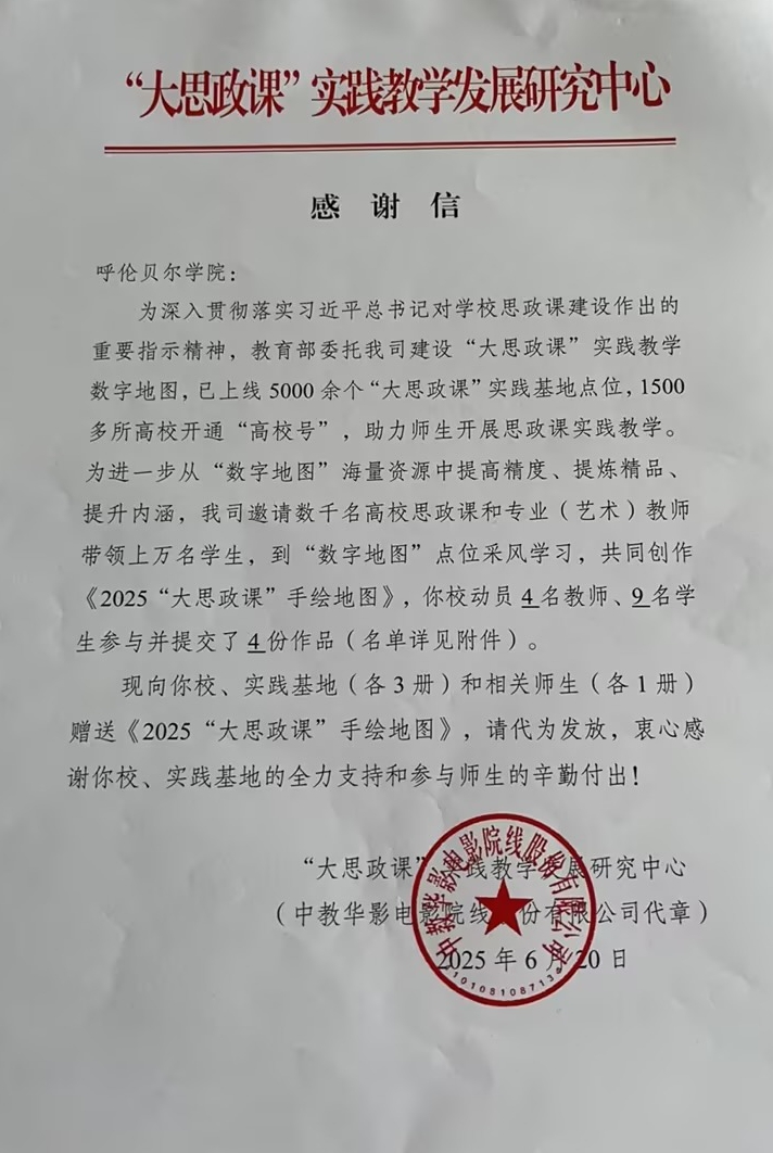 近日,Beat365收到了一封来自“大思政课”实践教学发展研究中心的感谢信。信中对Beat365马克思主义学院在教育部委托项目“大思政课”实践教学数字地图建设中的全力支持,以及参与师生的辛勤付出表示衷心感谢,并向马克思主义学院、实践基地(各3册)和相关师生(各1册)赠送《2025“大思政课”手绘地图》。信中提到,为深入贯彻落实习近平总书记对学校思政课建设作出的重要指示精神,教育部委托该中心建设“大思政课”实践教学数字地...