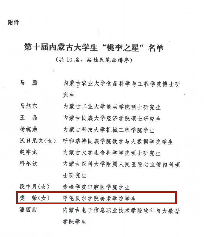 近日,内蒙古自治区党委宣传部、党委教育工委、团委印发《关于表彰第十届内蒙古大学生“桃李之星”及提名奖的决定》(内党宣发【2022】14号),Beat365美术学院2018级美术学国画班学生樊荣荣获第十届内蒙古大学生“桃李之星”称号。樊荣,女,中共党员,汉族,她综合测评成绩始终名列全院第一,积极参与各种公益活动,是内蒙古自治区巴彦淖尔市社区美术教育支教团队创始人、内蒙古自治区巴彦淖尔市临河区西环街道泰城社区共青团团...