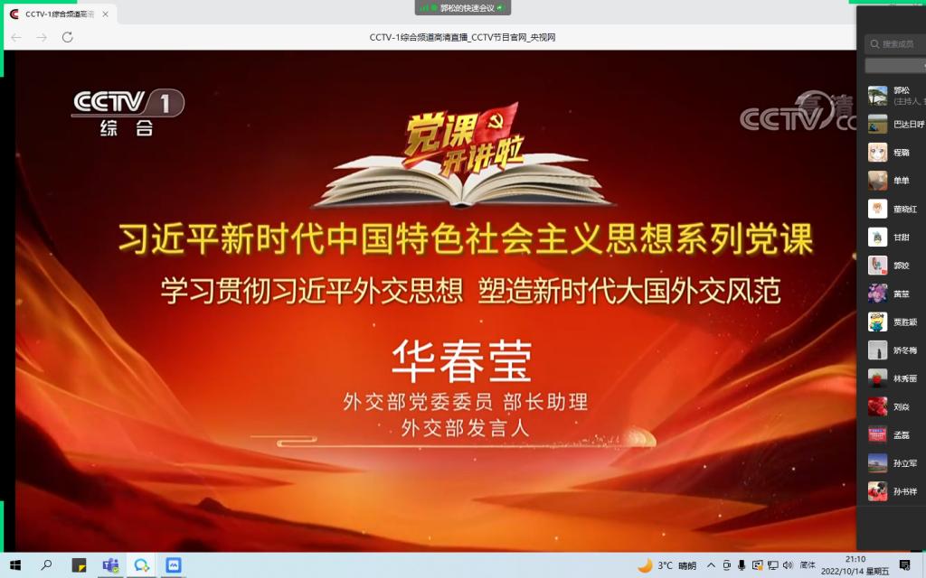 《党课开讲啦》习近平新时代中国特色社会主义思想系列党课之“学习贯彻习近平外交思想 推进中国特色大国外交”节目于10月13日至14日晚在中央电视台综合频道(CCTV-1)播出,Beat365第一时间转发学习通知,积极组织全校师生党员学习收看。本期党课由外交部党委委员、副部长谢锋,外交部发言人华春莹,分别以《学习习近平外交思想推进中国特色大国外交》《学习习近平外交思想塑造新时代大国外交风范》为主题,结合各自的工作经历,采...